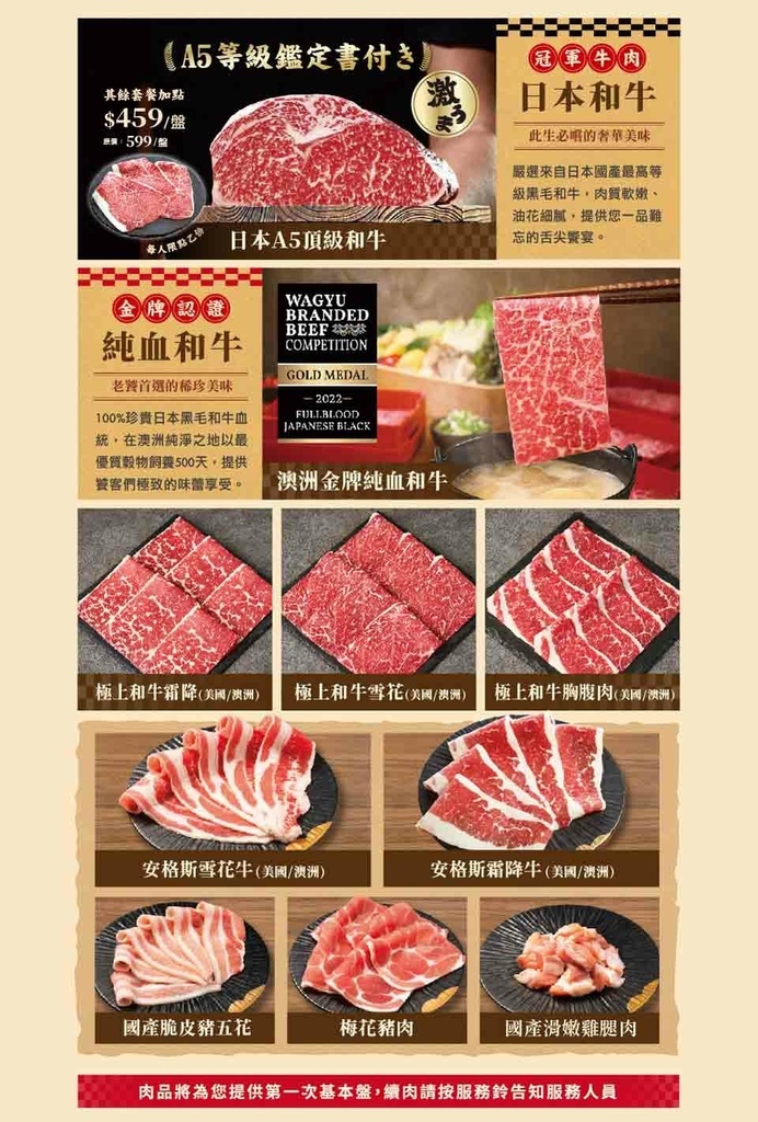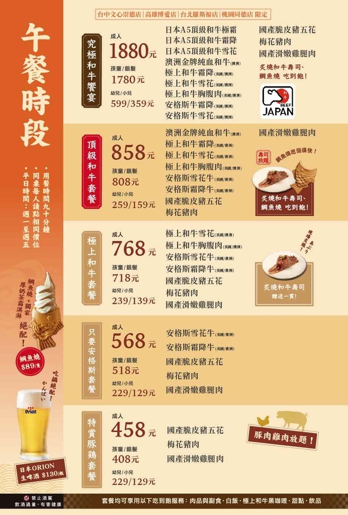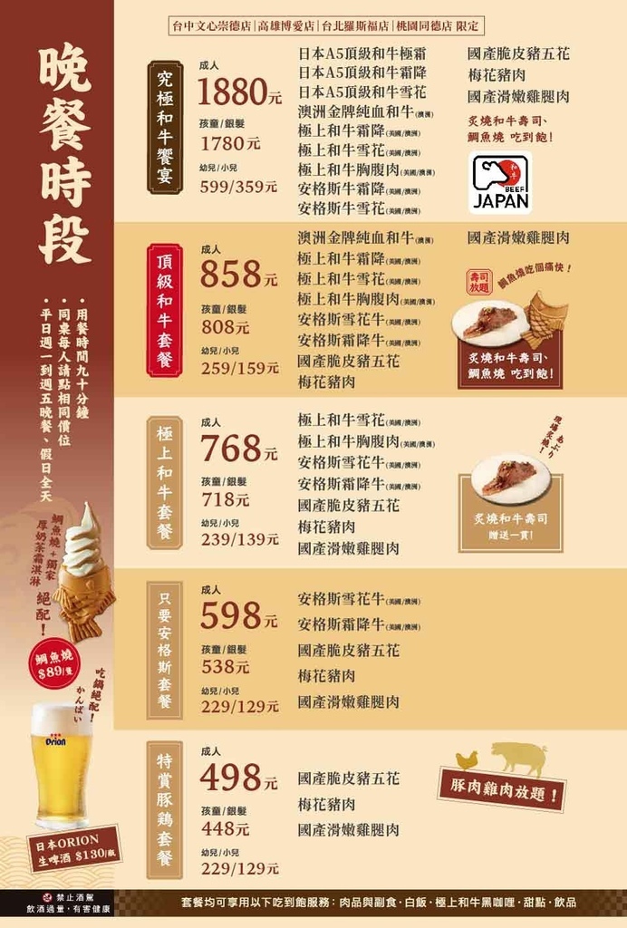 頂級和牛套餐:成人 858 元,孩童/ 銀髮 808 元,幼兒 259元,小兒 159元。