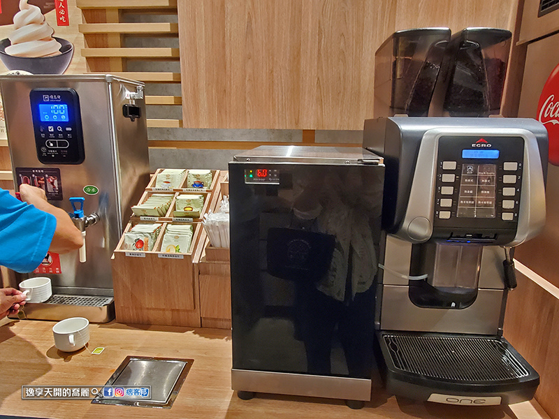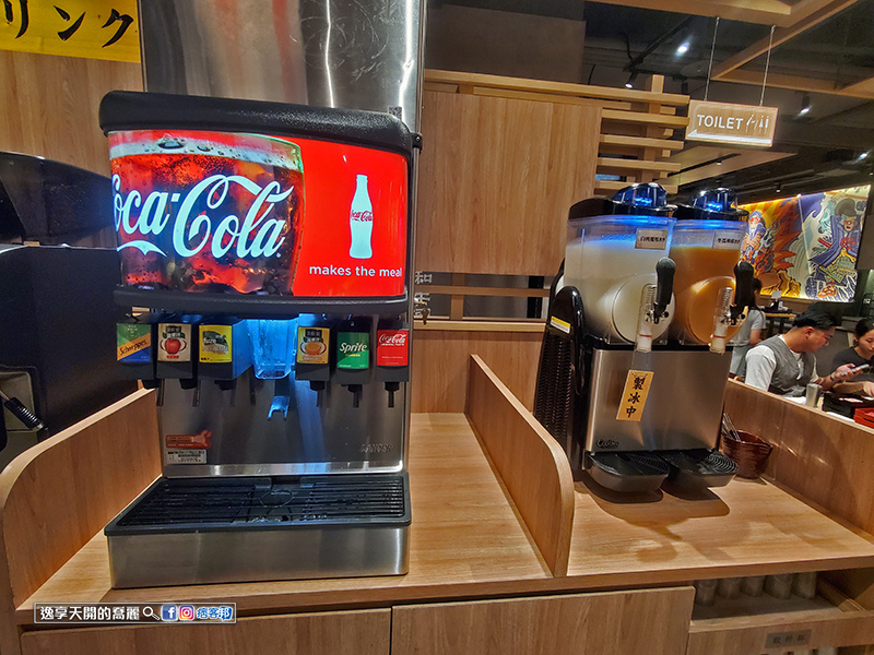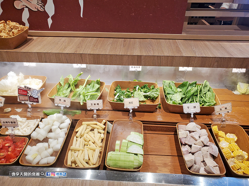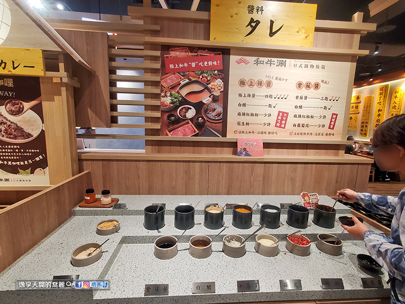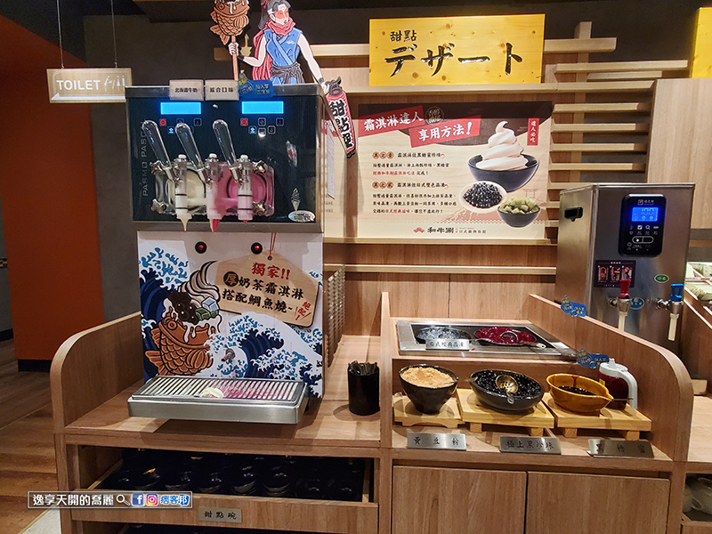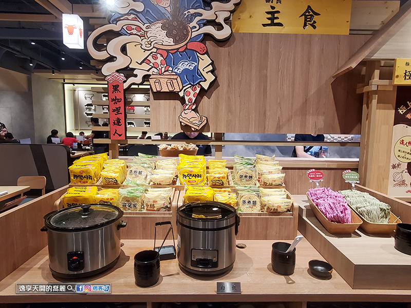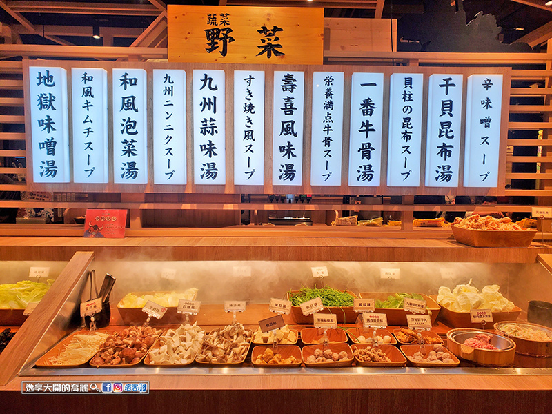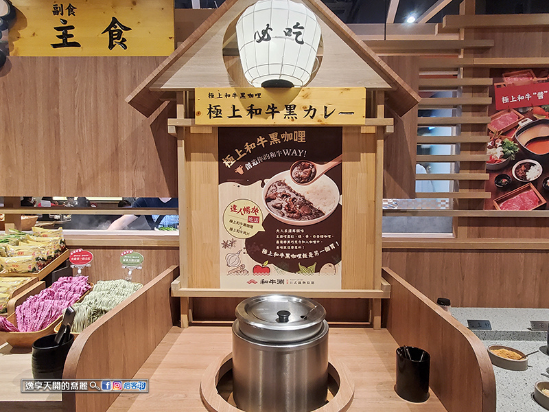 一進入用餐區就會看到ㄈ自型的自助取餐區,首先看到的是蔬菜與火鍋料區、背面是醬料區、極上和牛黑咖哩區、有著各種麵食、白飯的主食區、霜淇淋機、甜點配料區、飲料區、另一面是和牛壽司與鯛魚燒屋台